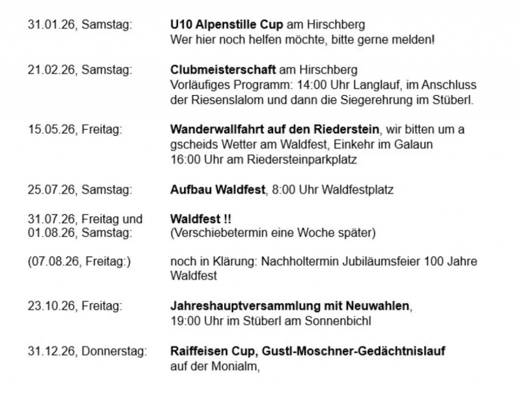 Zu allen Terminen gibt es wie gewohnt rechtzeitig noch einmal eine separate Info. Wir freuen uns auf große Beteiligung und viel Gaudi bei all unseren Veranstaltungen. Wenn wir alle z’amhelfen, klappt’s!
